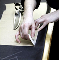 一套凱利易紳正裝,且體師要進(jìn)行20—30個數(shù)據(jù)的測量,在做的過程中,還要隨時找到身上的細(xì)微變化,以確保數(shù)據(jù)準(zhǔn)確無誤,并留下相關(guān)的影像資料備用.然后工藝師核對相關(guān)數(shù)據(jù),用紙板打出紙樣,進(jìn)行面料的裁剪。